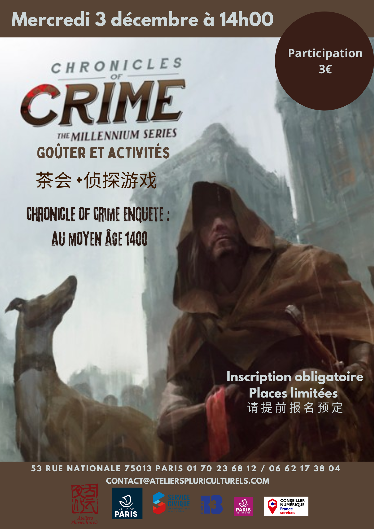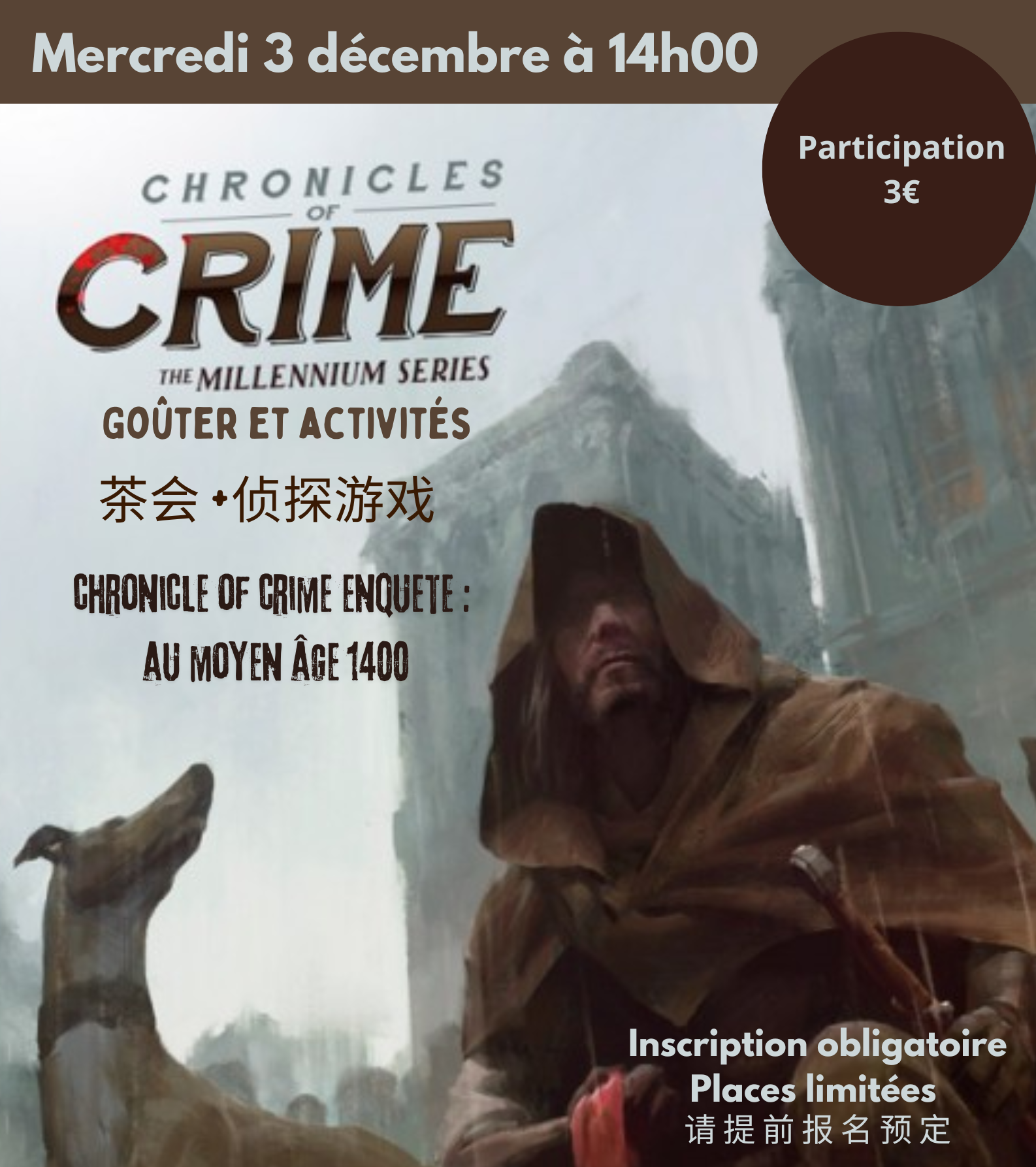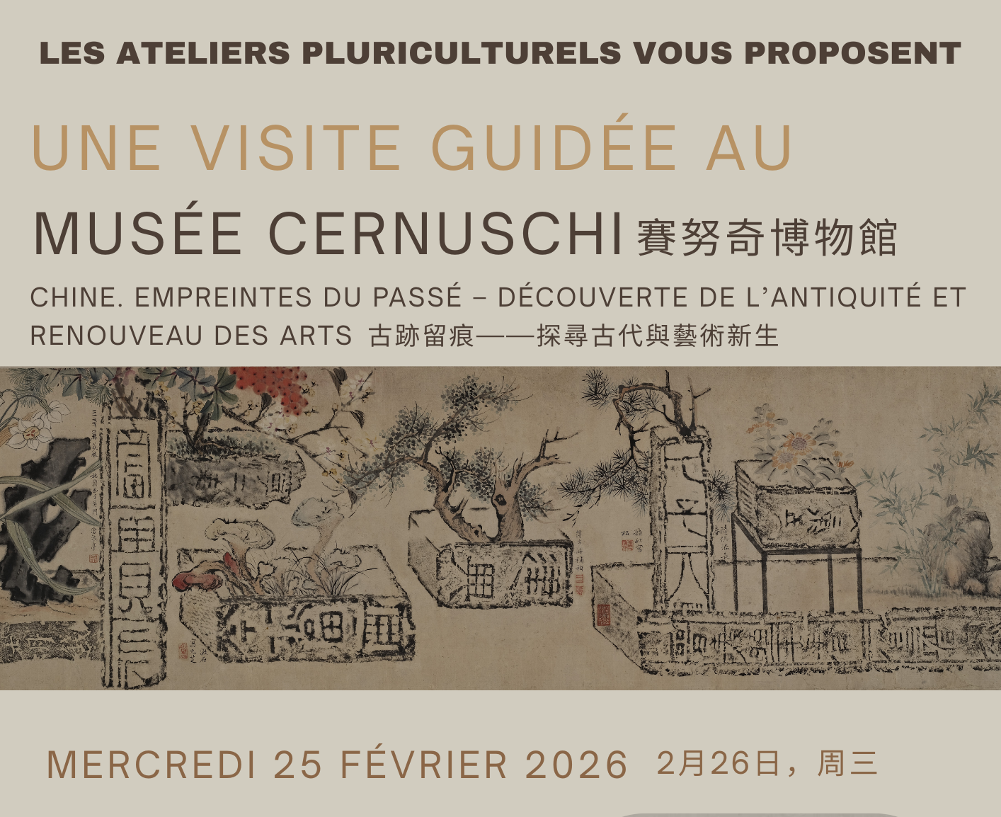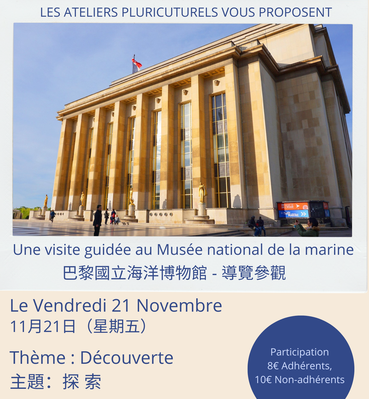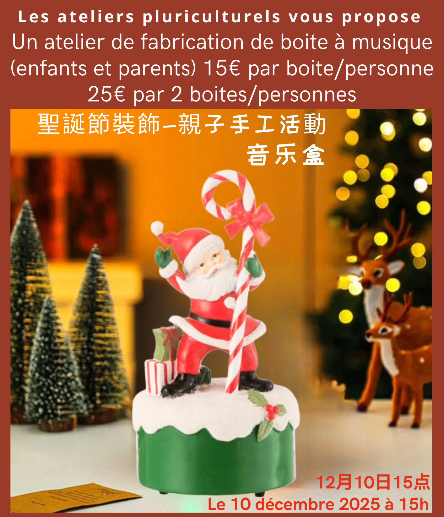 Activités temporaires Atelier Boîte à Musique Enfants/Parents 聖誕節裝飾-親子手工活動 音乐盒 À partir de 15,00 € Repas partage de Noël 会 员 聚 餐 0,00 € Musique classique et goûter 懷舊老唱片 + 茶點 3,00 € Atelier d’analyse de film 電 影 分 析 工 作 室 À partir de 3,00 € Un film et un goûter 看電影 + 茶點 3,00 € Visite guidée de l'hôtel de Soubise 苏比兹府邸 - 导览 À partir de 7,00 € Musée Cernuschi 賽努奇博物館 À partir de 7,00 € Maison européenne de la photographie À partir de 8,00 € Exposition « Coeur de bergère » d’Orla Barry 牧 羊 者 之 心, 关 于 “羊” 的 诗 歌 游 戏 À partir de 6,00 € Une visite guidée au Musée national de la marine 巴黎國立海洋博物館 - 導覽參觀 À partir de 8,00 € Formation numérique ASL 电脑, 手机, 互联网课 25,00 € Conseil en image 個人形象設計 2,00 € Musée Albert Kahn 阿爾貝·卡恩博物館 À partir de 8,00 € Jeu d’enquête Policière 茶会 + 侦探游戏 3,00 € 🧘♀️ Séances de Kinésithérapie – 復健理療 À partir de 20,00 €